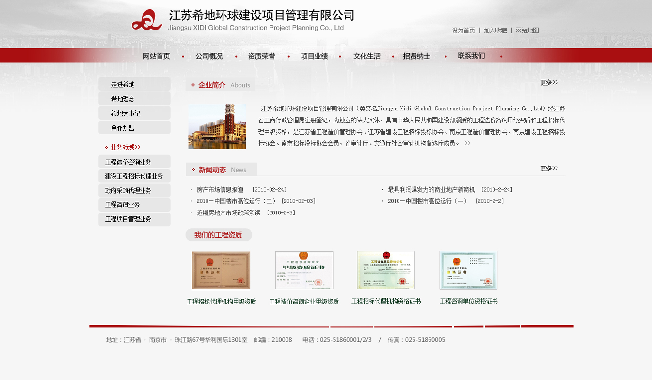 江蘇希地環(huán)球建設項目管理有限公司(英文名Jiangsu Xidi Global Construction Project Planning Co.,Ltd)經江蘇省工商行政管理局注冊登記,為獨立的法人實體,具有中華人民共和國建設部頒授的工程造價咨詢甲級資質和工程招標代理甲級資格,是江蘇省工程造價管理協(xié)會、江蘇省建設工程招標投標協(xié)會、南京工程造價管理協(xié)會、南京建設工程招標投標協(xié)會、南京招標投標協(xié)會會員,省審計廳、交通廳社會審計機構備選庫成員。公司主營工程項目管理、招標代理、造價審計、投資策劃、銷售代理、司法鑒定等咨詢服務業(yè)務。